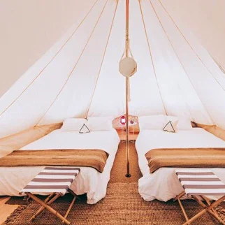 Share the experience with a friend in our double-occupancy glamping tent. Outfitted with two comfortable beds, this option combines the charm of outdoor living with the ease of modern amenities. A wonderful choice for those who wish to connect and unwind together. (1 tent available; first-come, first served basis)